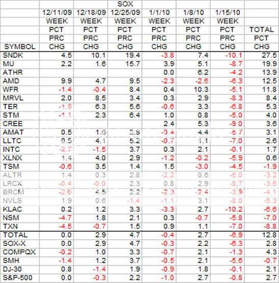 This is the longer 6 week look at the SOX table. The SOX drop this week essentially "wiped out" the gains of the previous 3 weeks. The index closed at 344.67 and 344.83 respectively. Eight of the stocks have recorded losses over the past 6 weeks.