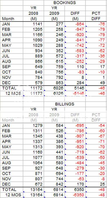 This is a more detailed look at the comparison of 2009 performance compared to 2008 performance. As the months proceeded through 09, the worst month of Mar for Bookings was down 79 percent compared to 08. By Dec, Bookings were up 49 percent compared to 08. The cyclic performance for Billings was very similar, but lagging the Bookings curve as should be expected.