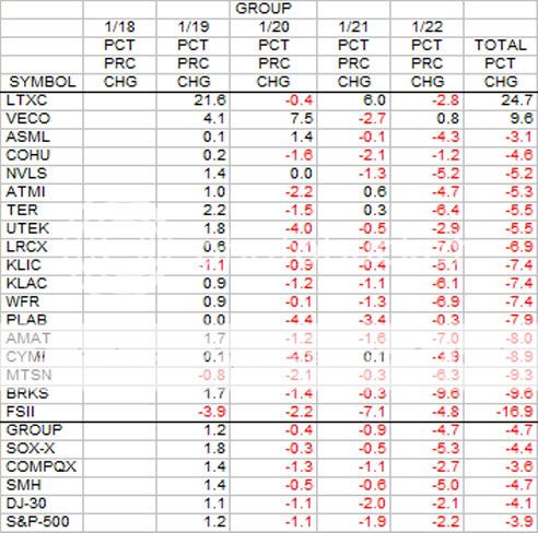 This was a 4 day week which started out fairly well on Tuesday, but from then on it was all downhill. Friday was a real bummer. For the Group, only LTXC and VECO finished above the line with FSII in last place with a 16.9 percent loss.