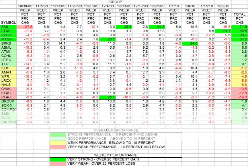 The rolling quarter also shows the downward trend this week. Only 4 stocks are in the deep green and 3 stocks are in the deep red. Five stocks finished in the yellow zone.