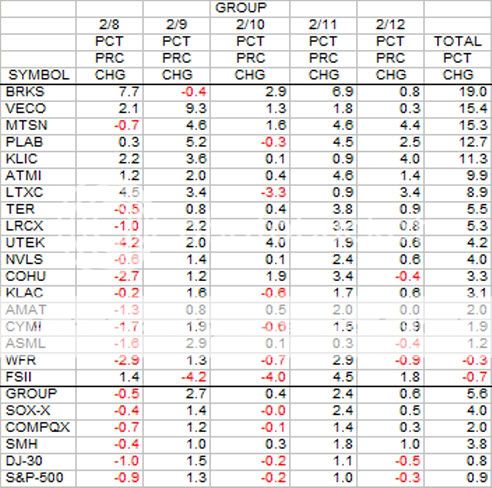 This is the weekly look at the Group stocks in terms of percent change. It was a strong week for the Group with 5 of the stocks up over 10 percent. All numbers at the bottom line were up for the week. Two of the stocks, WFR and FSII had a loss this week.