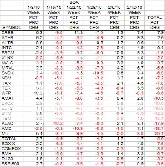 This is the longer 6 week look at the SOX stocks in terms of percent change. Here the effect of the rather severe correction during the heavy earnings reporting weeks can be seen. Eight of the 21 stocks lost more than 10 percent over the 6 weeks even with the good recovery of this past week.