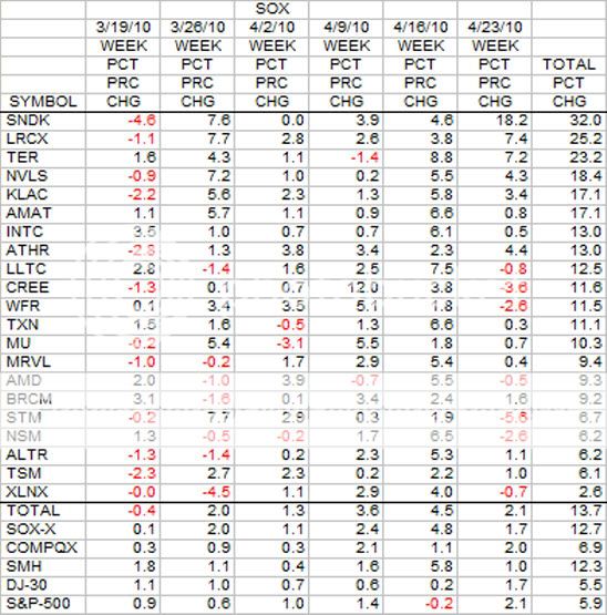 This is a longer 6 week look at the SOX stocks in terms of percent change. As with the Group, this was a very strong 6 weeks. All summary numbers above and below the line are in positive territory with SNDK in top spot with a 32 percent gain.