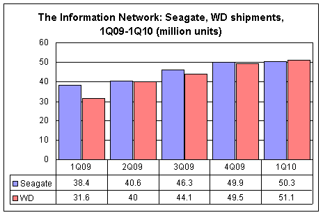 However, WD moved past Seagate in the first quarter of 2010, shipping 51.1 million units compared to 50.3 million for Seagate, said the research firm. WD may take the lead in the 2010 HDD market.