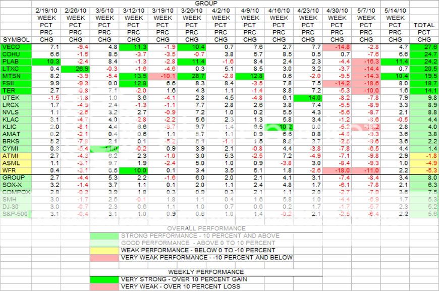 This is the update of the rolling quarter for the Group stocks in terms of percent change. This past week saw PLAB and MTSN gain over 10 percent. Overall the trend has been up for most stocks with all numbers at the bottom line in the green. Seven of the stocks have gains greater than 10 percent, and of those, 4 have gains greater than 20 percent.