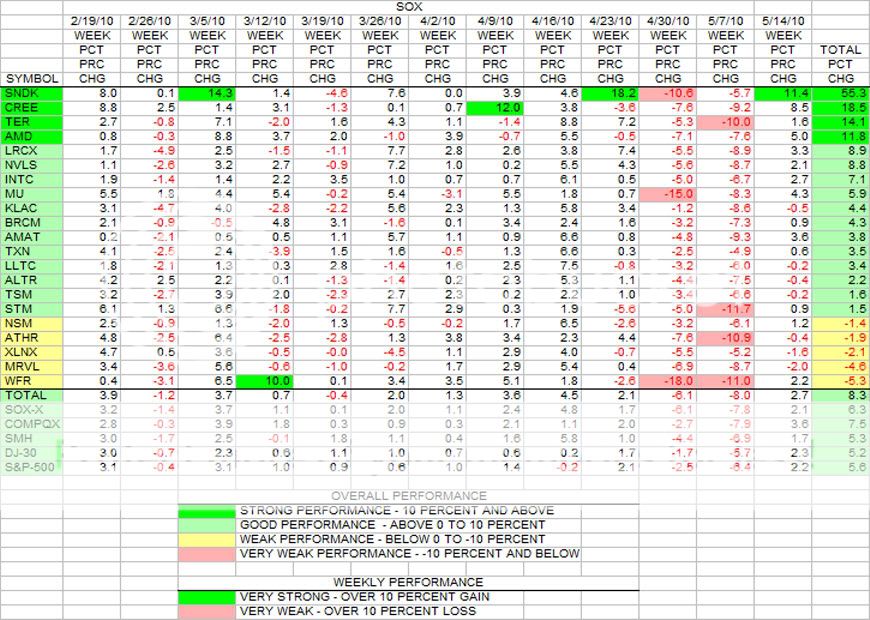 This is the updated rolling quarter for the SOX stocks in terms of percent change. Again, SNDK is the standout stock over the period with a gain of 55.3 percent. CREE, TER, and AMD are up over 10 percent. Five stocks are in the red over the period. All numbers at the bottom line are in the green.