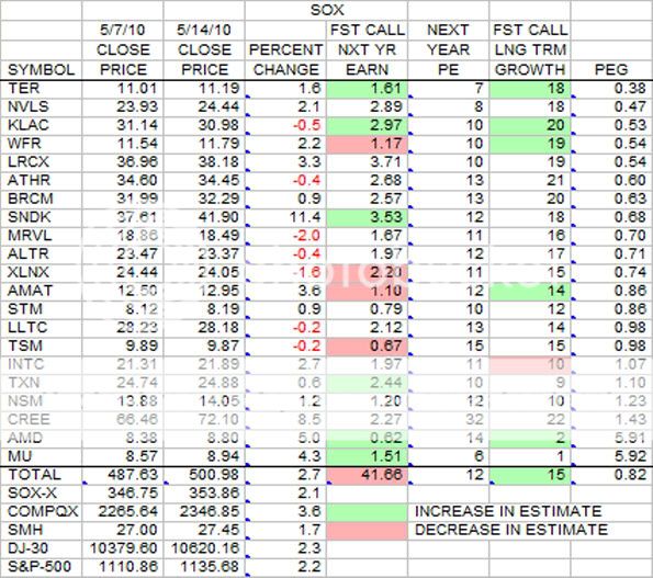 This is the same SOX data as the last post, but this time it is sorted by PEG. The bottom line numbers for PE and PEG are quite low by historical standards making room for possible future price gains.
