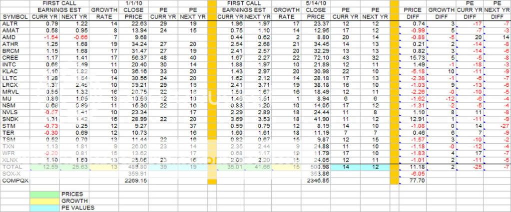 Since the first of the year, the SOX has gone through ups and downs, and as of last Friday's close, the index is near the value at the beginning of the year. Over that period, the individual stocks in the index have changed earnings estimates, growth and prices. Prior to the beginning of the year, the SOX was composed of 18 stocks, but at the beginning of the year, ATHR, CREE and LRCX were added to the index.