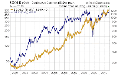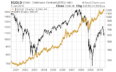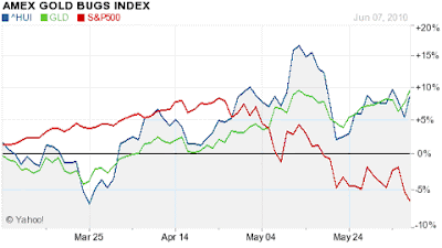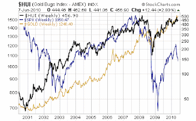 During this latest market rout started at the end of April 2010, the HUI index and Gold initially fell along with stocks. But then something odd happened: the HUI and Gold both stopped collapsing and actually began to rally while the S&P 500 continued to collapse: