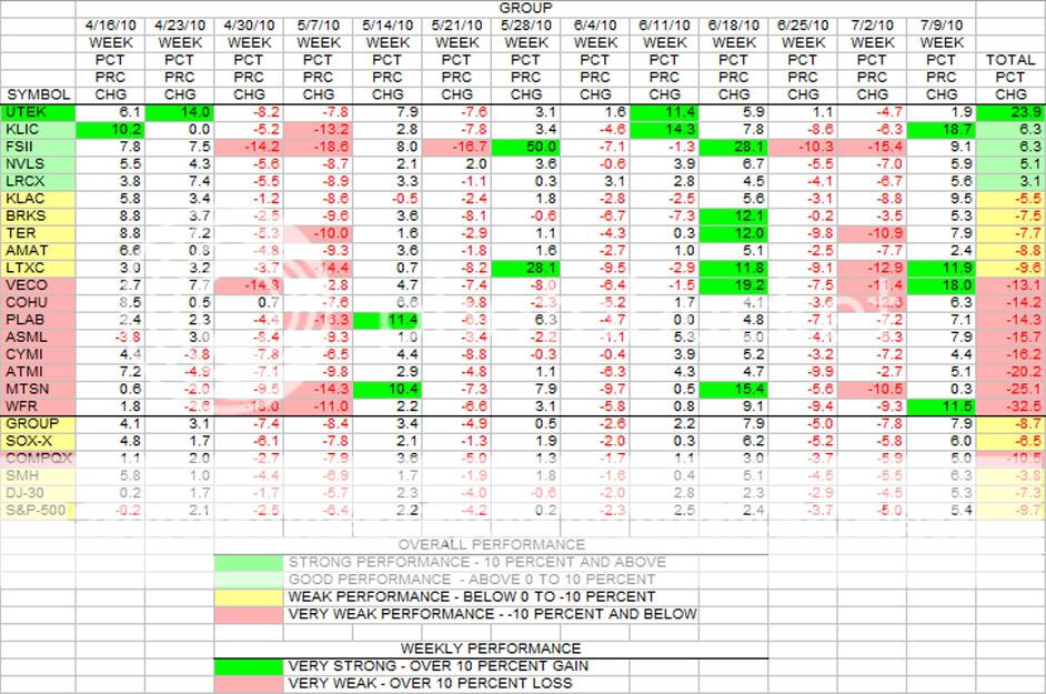 This is the look at the rolling 13 week quarter for the Group stocks in terms of percent change. Even though this past week was very strong, it was not enough to undue all the damage over the previous 12 week period. Only 1 stock, UTEK, had more that a 10 percent gain. Eight stocks were down more than 10 percent for the 13 week period. Note the NASDAQ is down over 10 percent during this period.