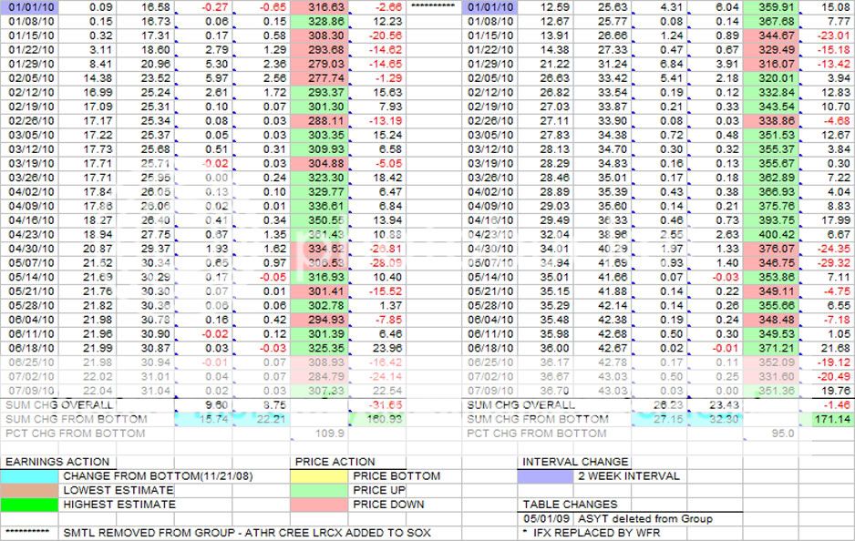 This is the weekly update of the Group/SOX tables in terms of earnings estimates and price changes. Earnings estimates increased again this week, but the amounts were very small. This is a sign of waiting for the quarterly reports that will start coming out this next week.