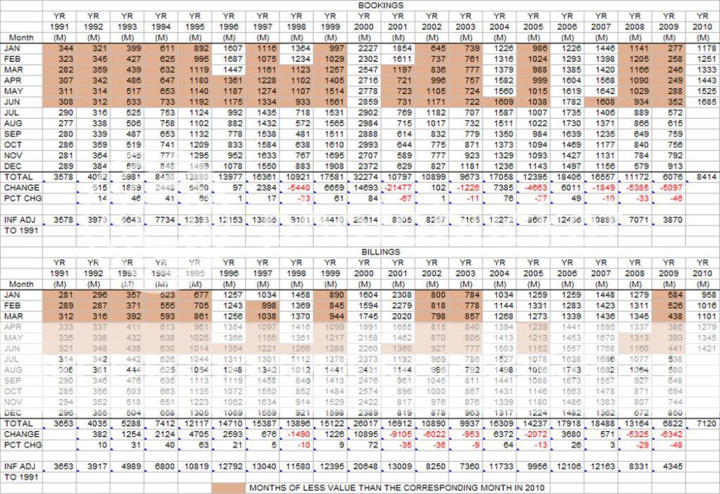 This is the long table for Bookings and Billings going all the way back to 1991. Bookings for the month of June this year are higher than all previous June months with the exception of 2000 and 2006.