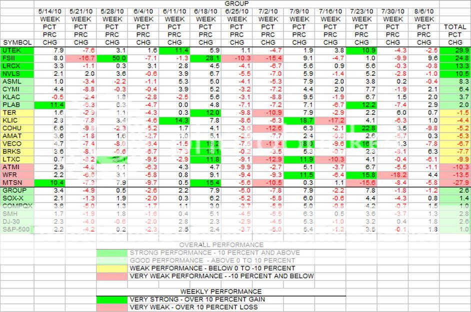 This is the update of the 13 week rolling quarter for the Group stocks in terms of percent change. There has been quite a change from last week's chart due to losing a very down week on the tail end and this past week which had a positive gain. There are 7 "positive" weeks and 6 "down" weeks in the table which leaves the bottom line with very little change overall.