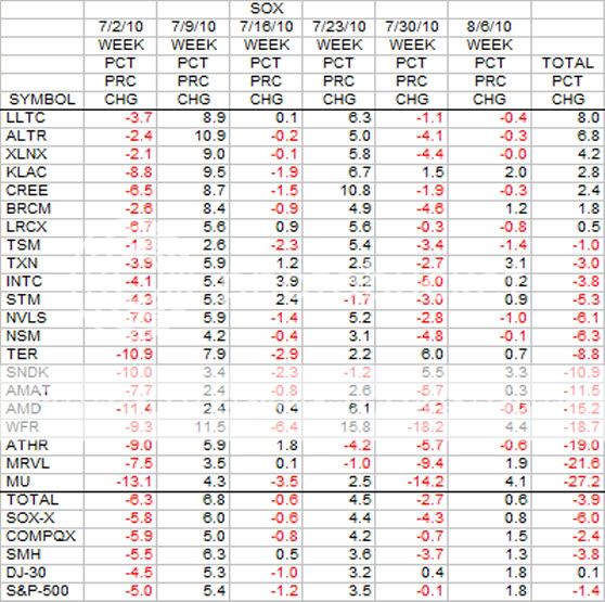 This is the longer 6 week look at the SOX stocks in terms of percent change. A lot of red over the 6 week period which will change quite a bit next week when the left most week rolls out of the way.