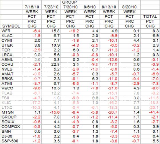 Of the 6 weeks, 7/23 was very positive while the week of 8/13 was very negative. Both the Group and the SOX are negative over the 6 weeks, while SMH was up 0.1 percent, and the other 3 major indices made some very nice gains.