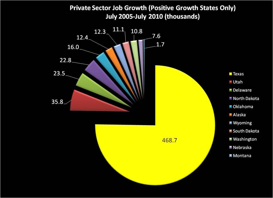 Only eleven states added private-sector jobs from 2005 to 2010, and thirty-nine lost them. Among those eleven states that added any private sector jobs over the past 5 year period, Texas is responsible for the creation of 80.57% of all private-sector jobs in America.