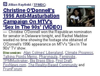 Christine O'Donnell won the Delaware primary last night, and within minutes (literally) über liberal Rachel Maddow started running video and commentary on MSNBC about O'Donnell's views on masturbation.