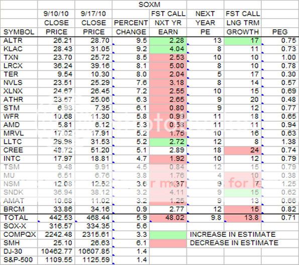 This is the weekly look at the SOXM stocks in terms of earnings estimates, growth estimates and price changes sorted by price percent change. Sixteen of the 21 stocks had downward changes in Nxt Yr earnings estimates. This is a follow up to roughly the same number of downward earnings estimates last week.