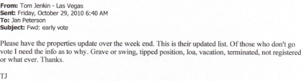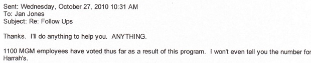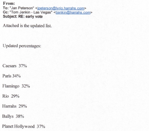 On Friday, Western Regional President Tom Jenkin sent out a follow-up email showing a total vote count for Harrah’s properties along with the percentages of employees who had voted at each property. Attached to the email was a spreadsheet showing employee names and at which property they worked. Supervisors were asked to fill in codes explaining why their employees had not yet voted...