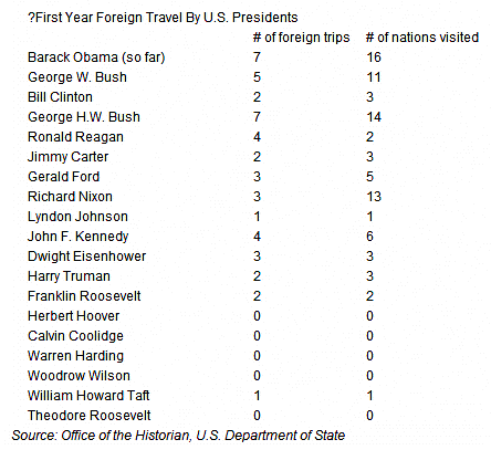 The only other president to come close to Mr. Obama's first-year-in-office globe-trotting numbers is President George H. W. Bush, who took 7 foreign trips to 14 countries.