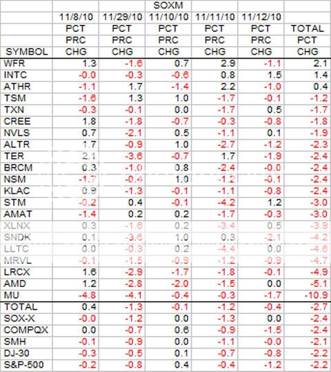 The loss for the week was 2.7 percent with the SOX down 2.4 percent. Only 3 stocks finished in positive territory. MU was the big loser, down 10.9 percent.