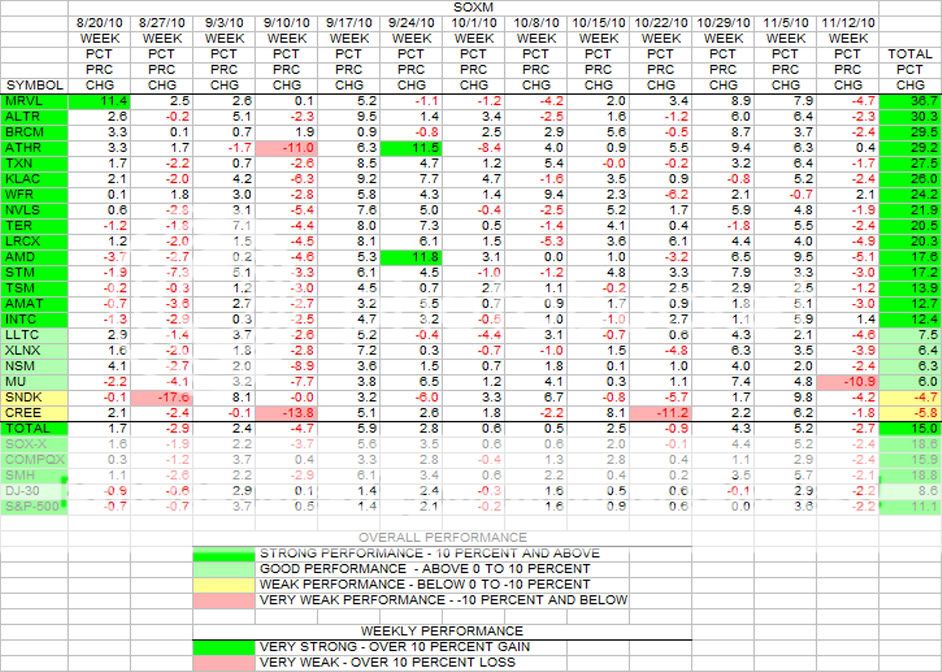This is the weekly update of the 13 week rolling quarter for the SOXM stocks in terms of percent change.