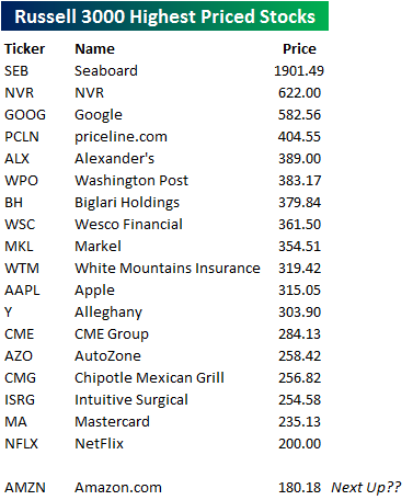 Netflix (NFLX) became the newest member of the Russell 3000 $200 club as the stock managed to rally all day in the face of an otherwise weak tape. With the stock now eclipsing that level, there are now 18 stocks in the Russell 3000 with share prices in excess of $200 (Berkshire Hathaway (BRK.A) is not in the Russell 3000). Will Amazon.com (AMZN) be the next stock to join the list?