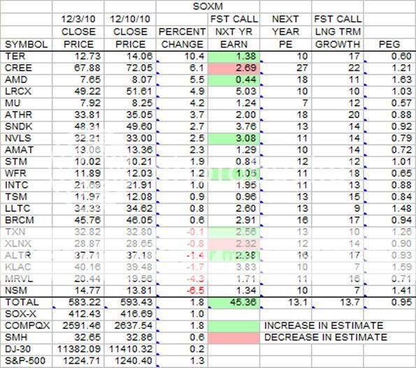 This week brings both upgrades and downgrades to earnings estimates. MRVL and NSM were down significantly this week. TER was way out in front of the pack with a 10.4 percent gain.
