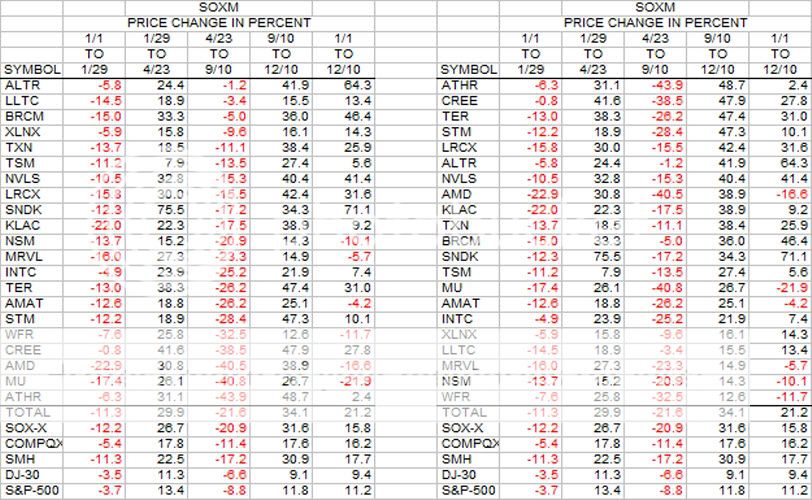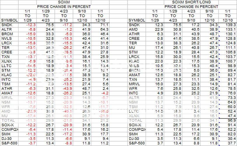 This first table shows percent changes in each of the 4 channels in the chart as well as the overall results year to date with prices sorted by price percent change. Note that in the first 4 columns, the results are all negative or all positive for each stock depending on the channel. There are 2 negative channels and 2 positive channels. I am stating the obvious, but going long in a negative channel or going short in a positive channel is a sure way to commit financial suicide. Finding the right stock to go long or short in the respective channel can be more rewarding than picking other lesser performing stocks, but no matter what stock is picked, money is made if long in an up channel or short in a down channel. That is why it is so important to determine channel direction changes as soon as possible.
