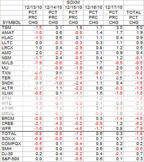 A little more red here for the SOXM then the Group. Only 6 of the 21 stocks are up for the week. Would you believe that TSM and AMAT are at the top of the list this week? The first 3 days of the week were down while the last 2 days were up.