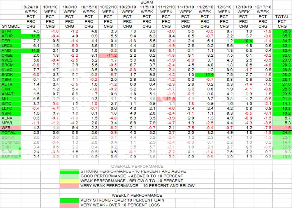 This the update of the 13 week rolling quarter for the SOXM stocks in terms of percent change.