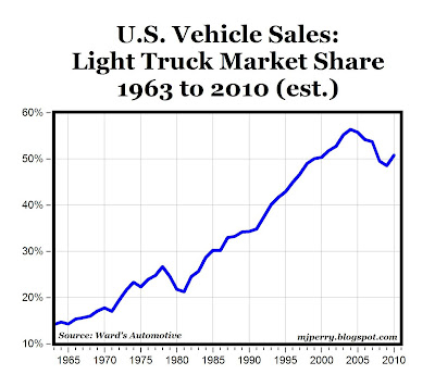 Also based on sales data through November from Ward's, the light truck share of the U.S. vehicle market will increase to 50.8% in 2010 from 48.5% last year. This will be the first time since 2007 that light truck sales will be more than half of all vehicle sales, and the first year since 2005 that the market share of trucks has increased (see chart below).