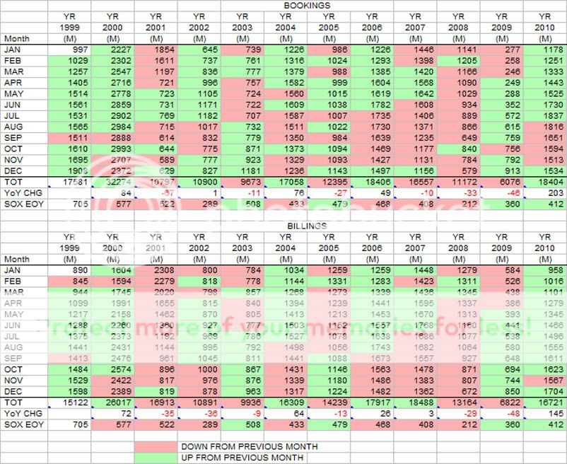 The data for December allows for comparison of the year 2010 to previous years at the bottom line. The Bookings for the year of over 18B compares almost identically with the year 2006. The YoY change of 203 percent compared to 2009 reversed 3 years of sharply falling Bookings. For the past 3 months, Bookings have remained in the 1.5 to 1.6 Billing dollar range which hopefully will continue or increase as 2011 unfolds.