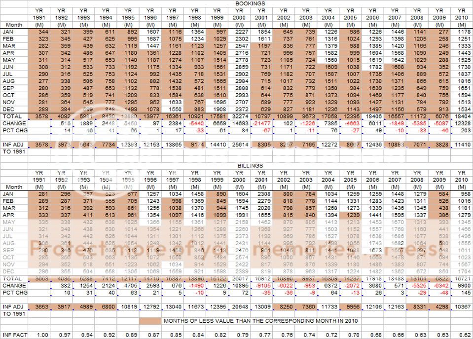 This is the update of the table for Bookings and Billings that covers the period from 1991 through 2010.