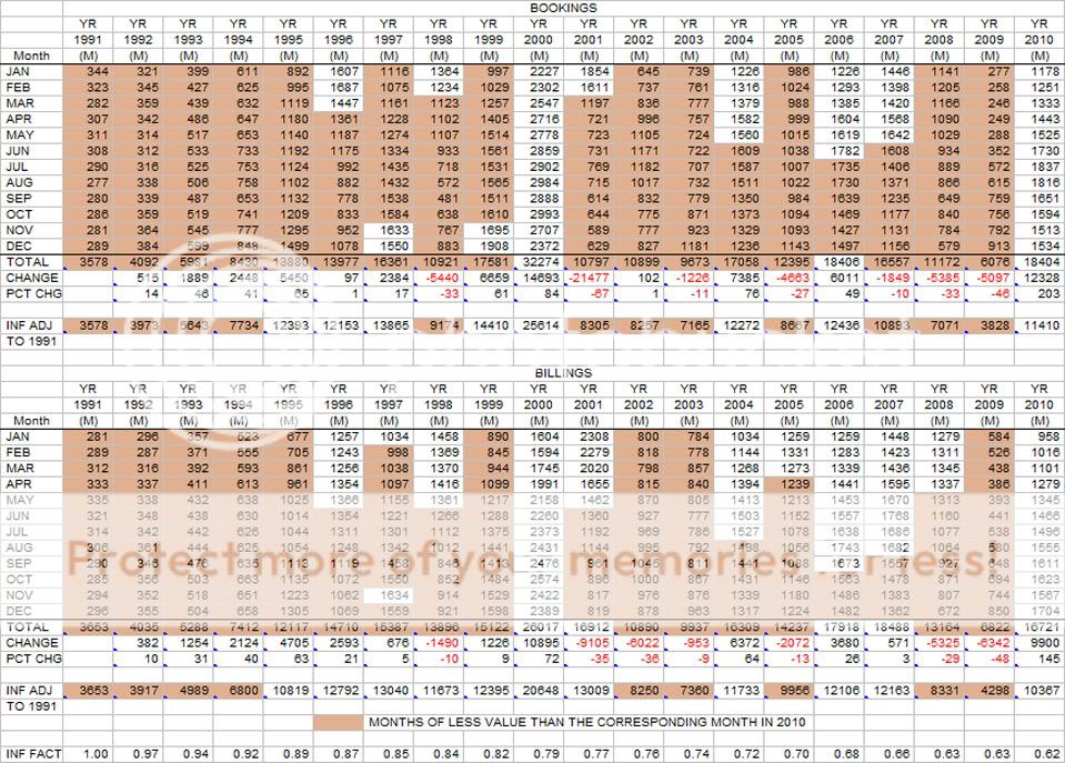 <<This is the update of the table for Bookings and Billings that covers the period from 1991 through 2010.