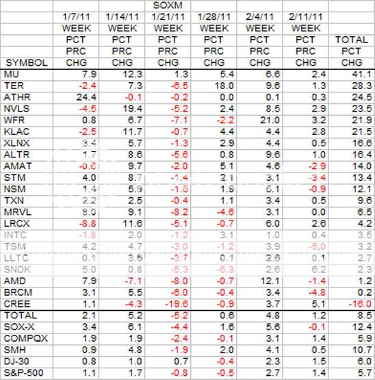 In looking at the Monday's edition of IBD, an article was written about when to "get out" of a stock. This fits in with the 6 week look at the SOXM stocks shown earlier this weekend in: