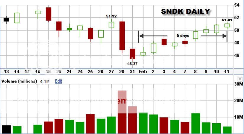 Well, I think I "hit it" just about on the head. On Thursday, 27 Jan, SNDK closed at 51.32 before they announced their earnings report AH. After the next 2 trading days, the price closed at 45.37. Since then, in the next 9 trading days, the price has recovered to close on Friday at 51.01.