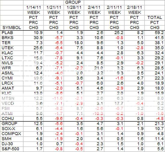 PLAB is easily in 1st place with a 59.2 percent gain. Only 2 stocks, ATMI and COHU, finished in the red. Thirteen of the 18 stocks finished with gains of more than 15 percent.