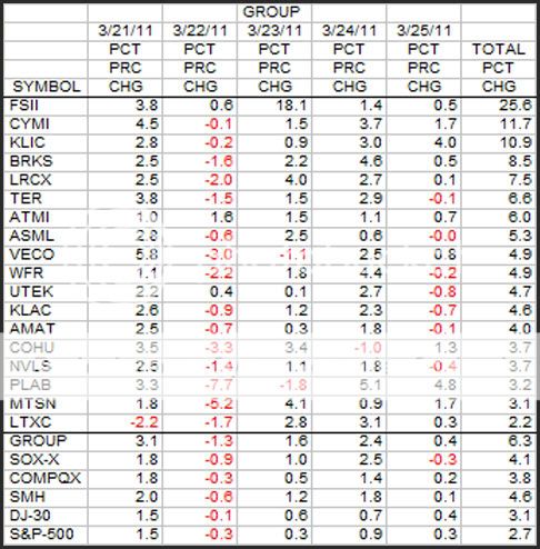 A down day on Tuesday, but overall, a very strong week. All 18 stocks were up for the week with FSII and ATMI up all 5 days in a row. FSII, CYMI and KLIC were up over 10 percent.