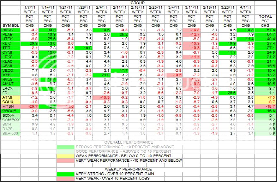 Over this quarter the Group did extremely well compared to the other indices. The gain was 16.8 percent compared to the SOX gain of 5.1 percent. The smaller cap stocks are at the top of the list showing much larger percent gains compared to the larger cap stocks.