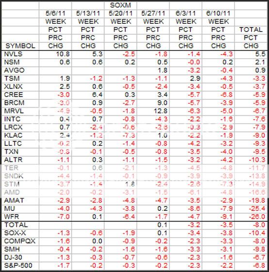 This is a longer 6 week look at the SOXM stocks in terms of percent change.