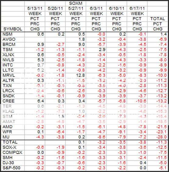 Here all of the stocks are deep in the red with the exception of NSM "out of play" while waiting to be acquired by TXN. AMD, WFR and MU are all down over 20 percent. TXN, LRCX, SNDK, AMAT and AMD were down every week for 6 weeks.