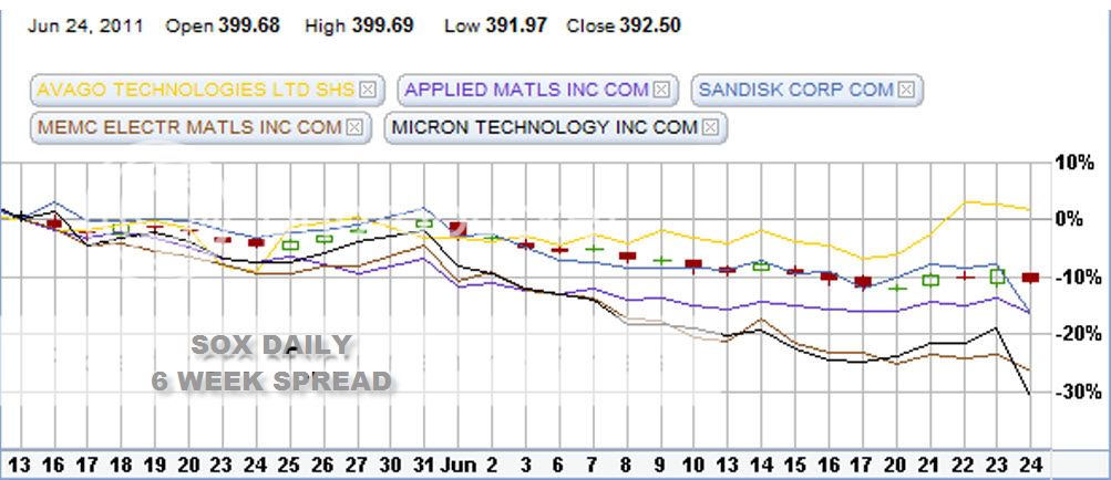 The chart below is a picture of the last 6 weeks for the SOX compared to 5 other stocks in the SOXM. Actual percent values for all are shown in the table at,