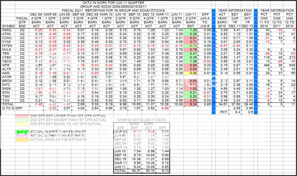 However, there are some caveats. Three of the companies, VECO, STM, and TSM did not meet estimates. More importantly, looking at the right hand columns, bottom line estimates for 2011 and 2012 are anemic at best compared to the actuals for 2010. Seven of the 18 stocks in the table have estimates for 2011 that are less than 2010 actuals. Four of the stocks have estimates for 2012 that are less than 2010 actuals. Bottom line percentage increase estimates for 2011 and 2012 compared to actuals for 2010 are quite small.