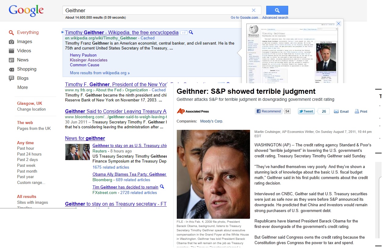 Geithner. He comes across as tough and knows what he is talking about, but Larry Summers has already played that losing hand. When I type "Geithner" into Google I get this....