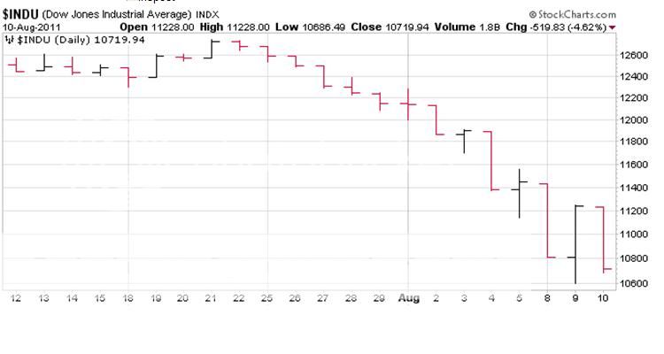 The charts below are recent trading histories of the Dow Jones Industrial Average and the Dow Jones Transportation Average. Notice how on Aug. 10, while the Dow Jones Industrial Average closed below its previos two days' lows, but a non-confirmation was given by the Transportation Average. In my opinion, this would indicate that we are already at, or near the bottom, of the recent "market crash".-