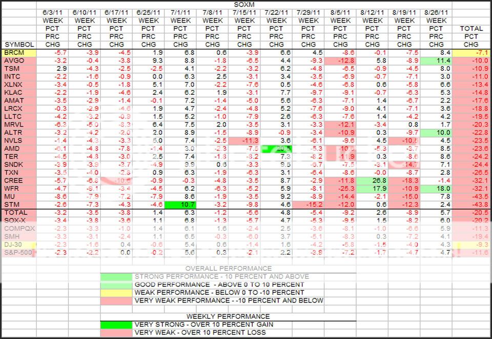 Again, this past week was just good enough to move a couple of numbers into the yellow category. CREE, WFR, MU, and STM are still down over 30 percent for the 13 weeks.