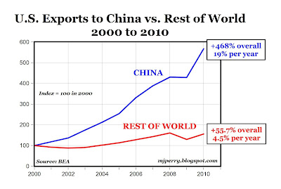 Over the last decade from 2000 to 2010, U.S. exports to China grew by 468%, which was more than 8 times the 55.7% growth in exports to the rest of the world (see chart above of indexes for both series that are equal to 100 in the year 2000). On an annual basis, exports to China have been growing at an average rate of 19% over the last decade, more than four times faster than the 4.5% annual growth rate for exports to the rest of the world. Posted 5:04 PM