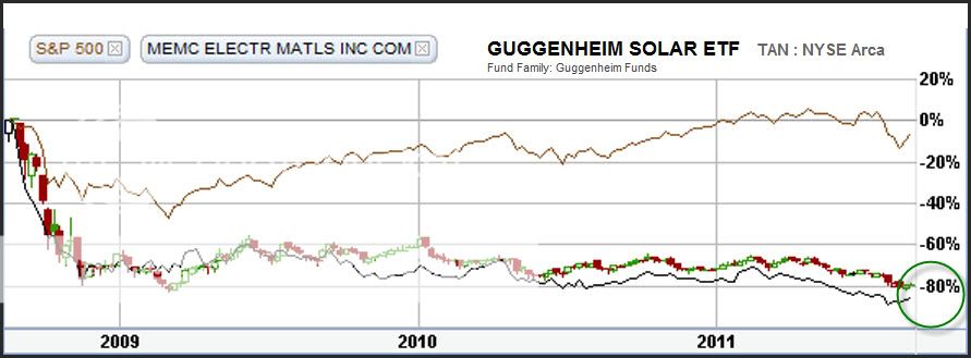 The chart starts on 15 Aug 2008, so the length is just over a 3 year period. TAN, starting around 25 dollars in Aug fell as low as 5 dollars in Nov 08 for about an 80 percent loss. Since then it recovered to about a 60 percent loss in 09, but since then it has been drifting downward to again reside at the -80 percent level.