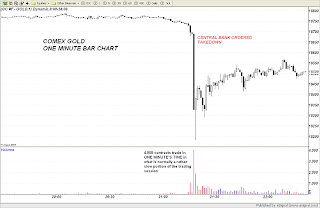 This effort can clearly be seen in the following ONE MINUTE BAR CHART which reveals an enormous spike of 4,000+ contracts in the middle of the evening during a time period in the gold trading not normally known for this sort of volume. The question must now be raised - if this was a hedge fund blowing out of a long gold position, why wait for such a low liquidity environment in which to execute to trade knowing full well that by so doing, one would be guaranteed the worst possible exit price for the trade. Also, since the price of gold has been RISING and NOT FALLING, why would any gold long be forced to unload a position. It certainly is not under any duress from price action. We can probably eliminate this as the cause therefore since only the rankest of fools would attempt such a thing.